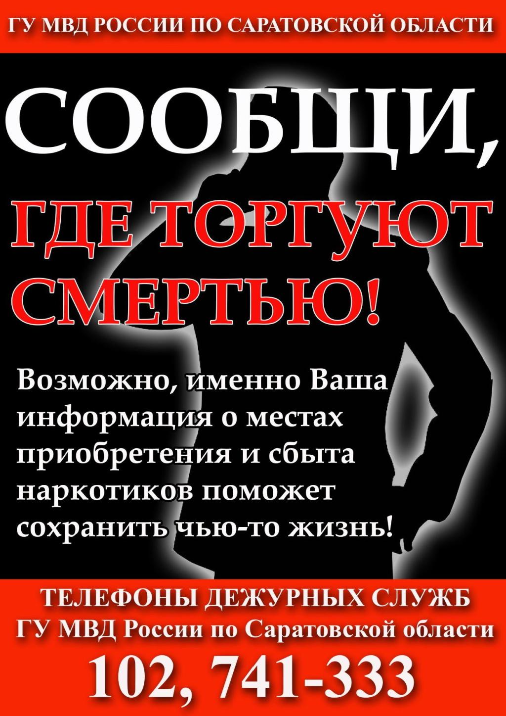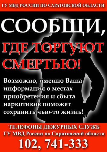 Любой гражданин может сообщить об известных ему фактах незаконного оборота наркотиков по телефону дежурных служб ГУ МВД России по Саратовской области: 102, 8 (8452) 741-333.